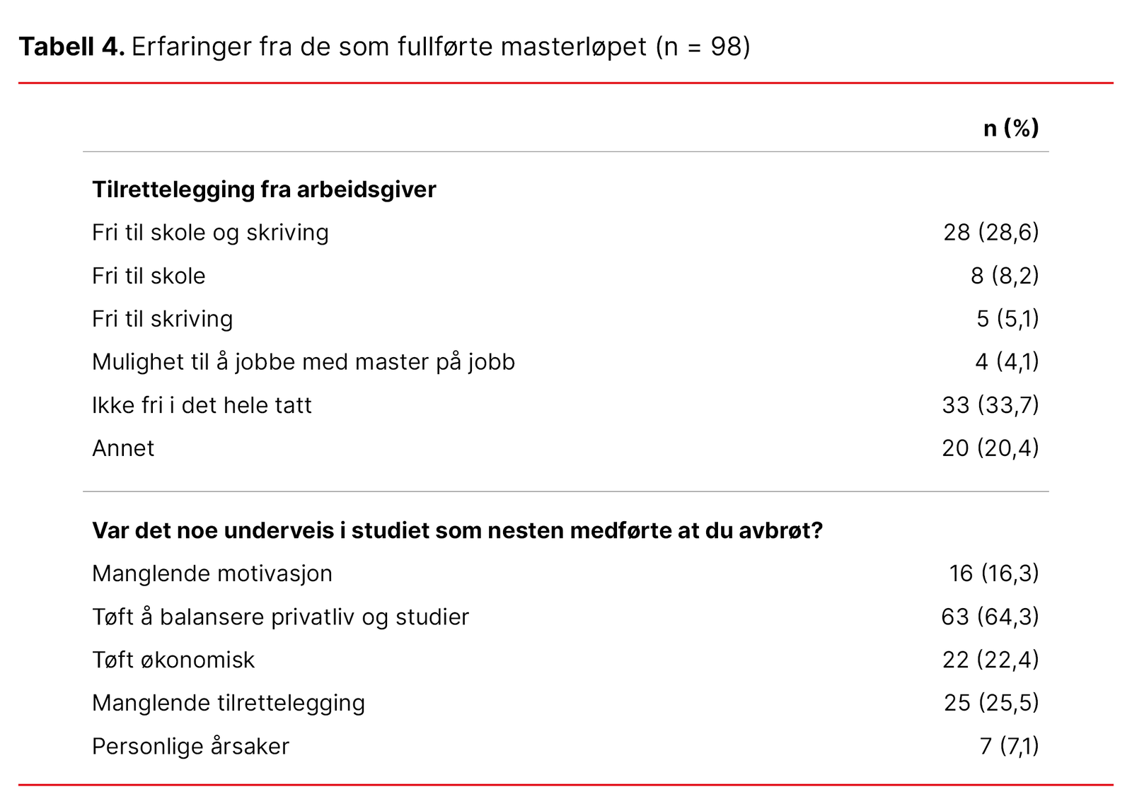 Tabell 4 gir en oversikt over hvordan arbeidsgiver hadde – eller ikke hadde – lagt til rette for at respondentene kunne fullføre hele masterløpet (n = 98). Den viser også ulike grunner til at respondentene nesten valgte å slutte underveis i studiet.