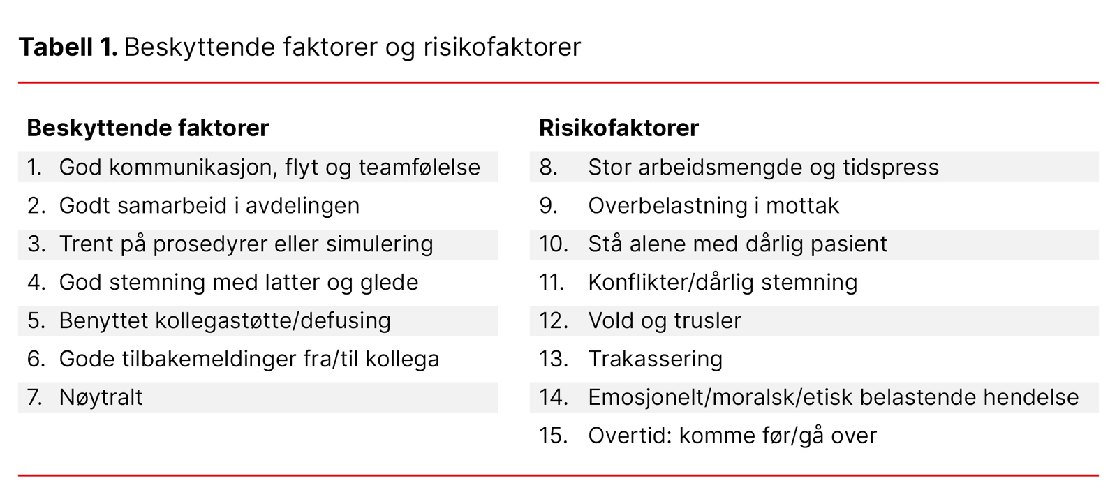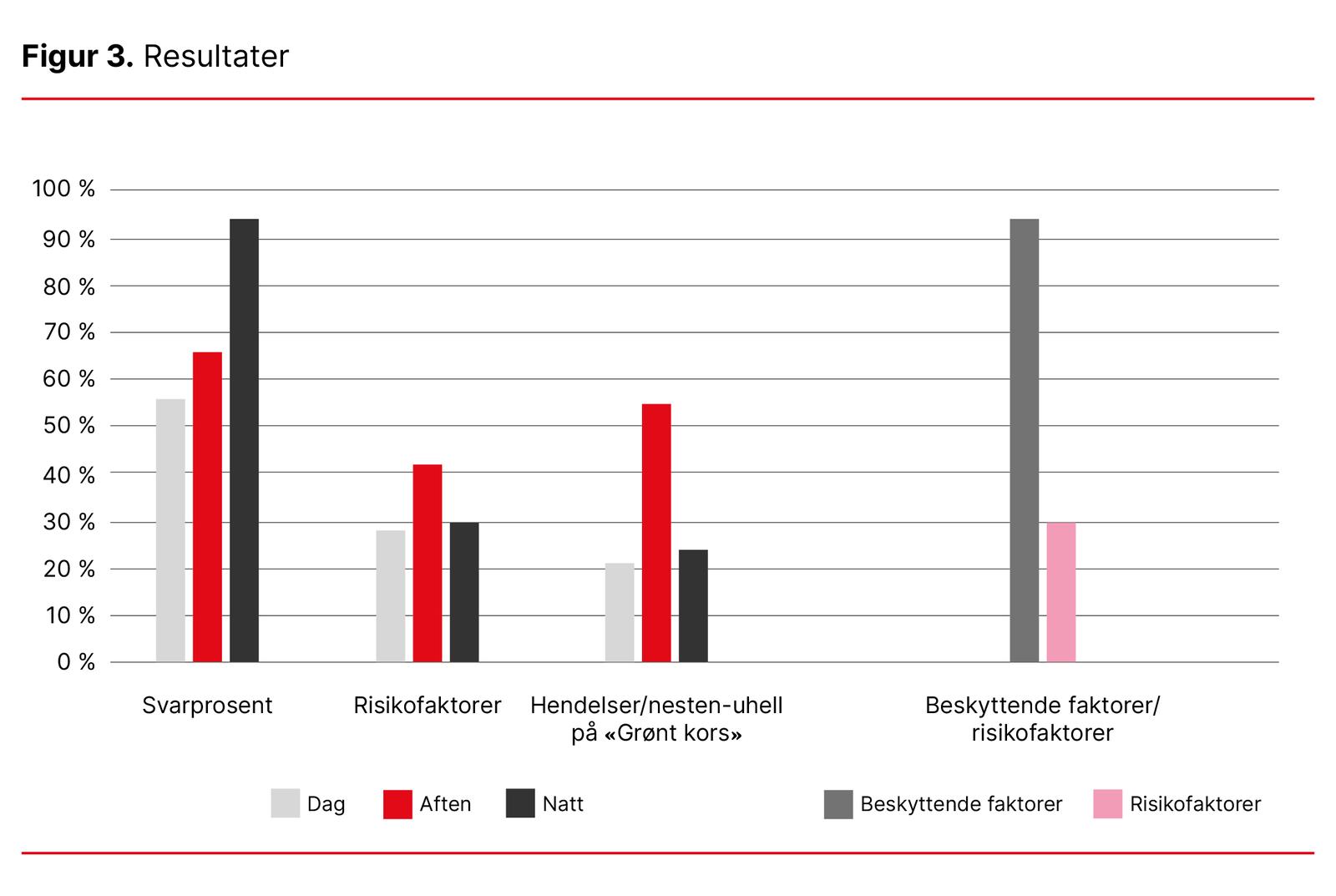 De beskyttende faktorene ble registrert i 96 prosent av vaktene, mens risikofaktorene ble registrert i 30 prosent. Grunnen til at prosentfordelingen ikke summerer til 100 prosent, er at én og samme vakt kan ha registrert både beskyttende faktorer og risikofarer.