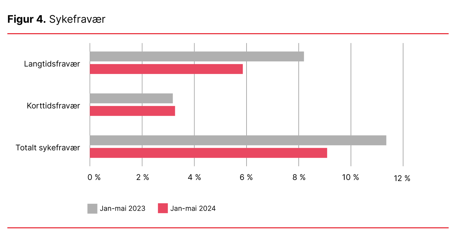 Det totale sykefraværet ble redusert fra 11,4 prosent til 9,1 prosent i prosjektperioden (se figur 4). Den største endringen gjaldt langtidsfraværet, som gikk ned fra 8,2 prosent til 5,8 prosent. Korttidsfraværet var tilnærmet uendret, fra 3,2 prosent til 3,4 prosent.