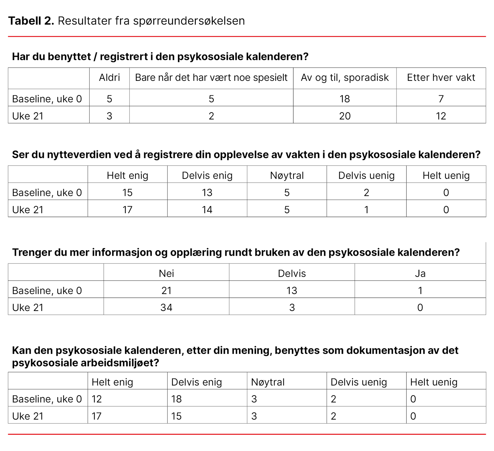 Den psykososiale kalenderen supplerer forbedringsundersøkelsen ved å registrere forhold knyttet til arbeidsmiljøet etter hver vakt. På den måten får vi bedre innsikt i hvordan psykososiale faktorer, som samarbeidsforhold, arbeidsbelastning og konflikter, kan påvirke risikoen for uønskede hendelser. Den løpende informasjonen gjør det enklere å oppdage behov for tiltak på et tidlig stadium.