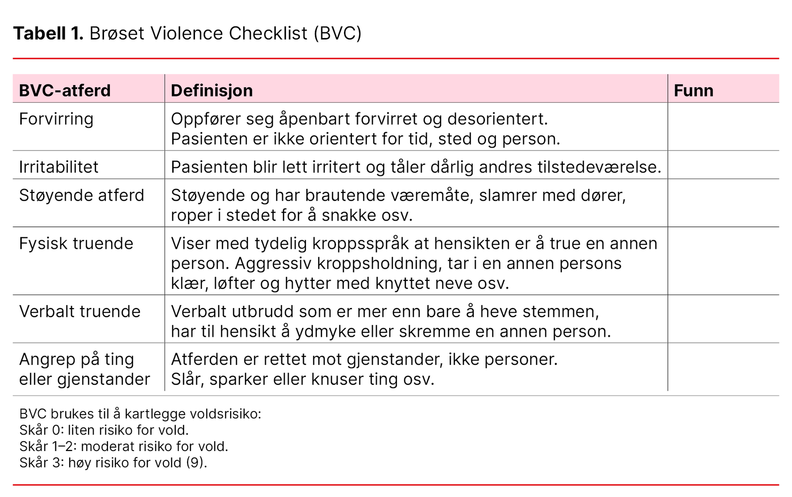 BVC er et anerkjent og enkelt scoringsverktøy som brukes av mange innen psykisk helsevern i Norge, og som det er forsket mye på (10). Å kunne bruke dette verktøyet er viktig for å forebygge situasjoner som kan eskalere med trusler og vold.