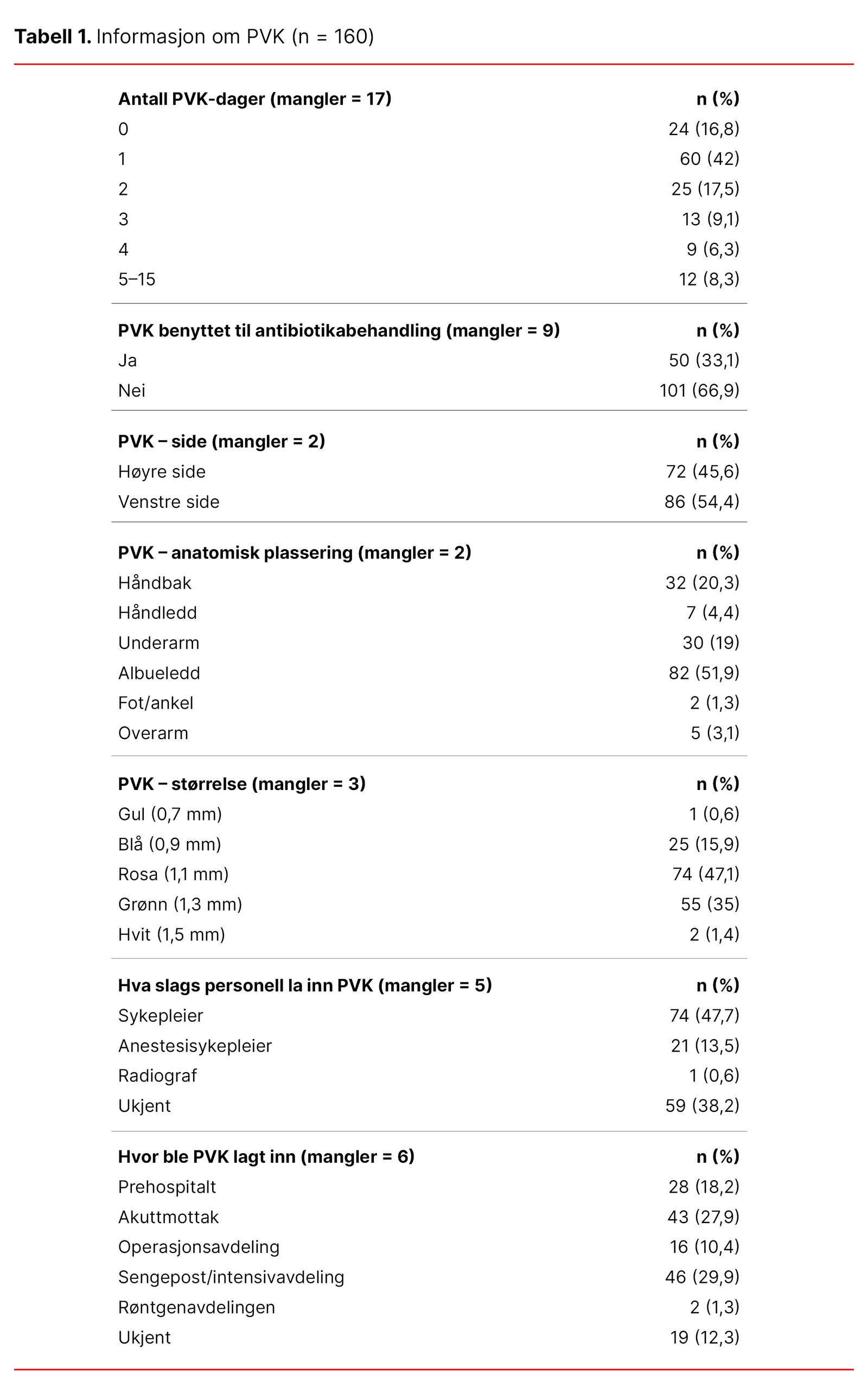 Av pasientene hadde 127 (88,8 prosent) én PVK, mens 16 (11,2 prosent) hadde flere. Blant disse hadde 15 pasienter to PVK-er (10,5 prosent), og én pasient (0,7 prosent) hadde tre. PVK-ene lå inne i median én dag. Deskriptiv statistikk over PVK-ene (n = 160) presenteres i tabell 1.