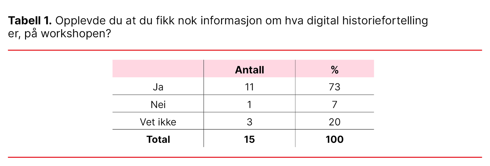 Tabell 1. Opplevde du at du fikk nok informasjon om hva digital historiefortelling er, på workshopen?