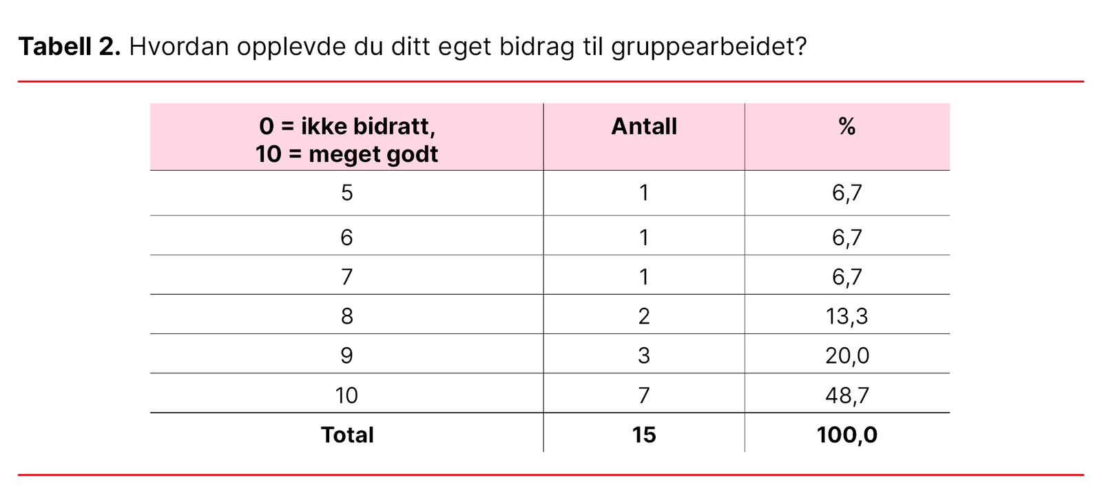 Tabell 2. Hvordan opplevde du ditt eget bidrag til gruppearbeidet?