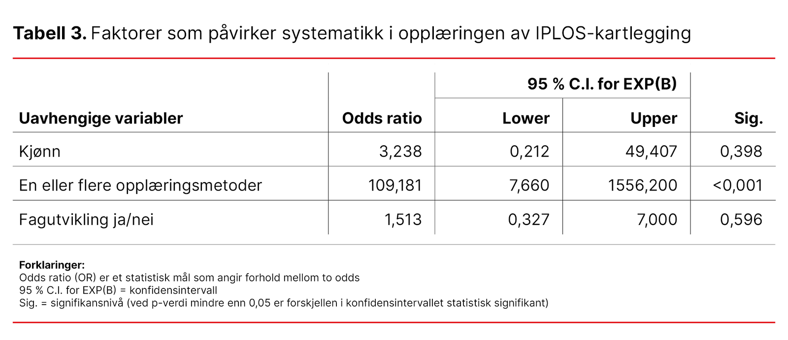 Resultatene fra den binære logistiske regresjonen (se tabell 4) viser at ansatte som får systematisk opplæring, har betydelig høyere sannsynlighet for å følge standardiserte kartleggingsprosedyrer. Med andre ord; ansatte med opplæring gjennomfører IPLOS-kartlegging langt mer systematisk enn de uten opplæring.