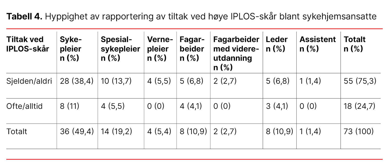 Tabell 4. Hyppighet av rapportering av tiltak ved høye IPLOS-skår blant sykehjemsansatte