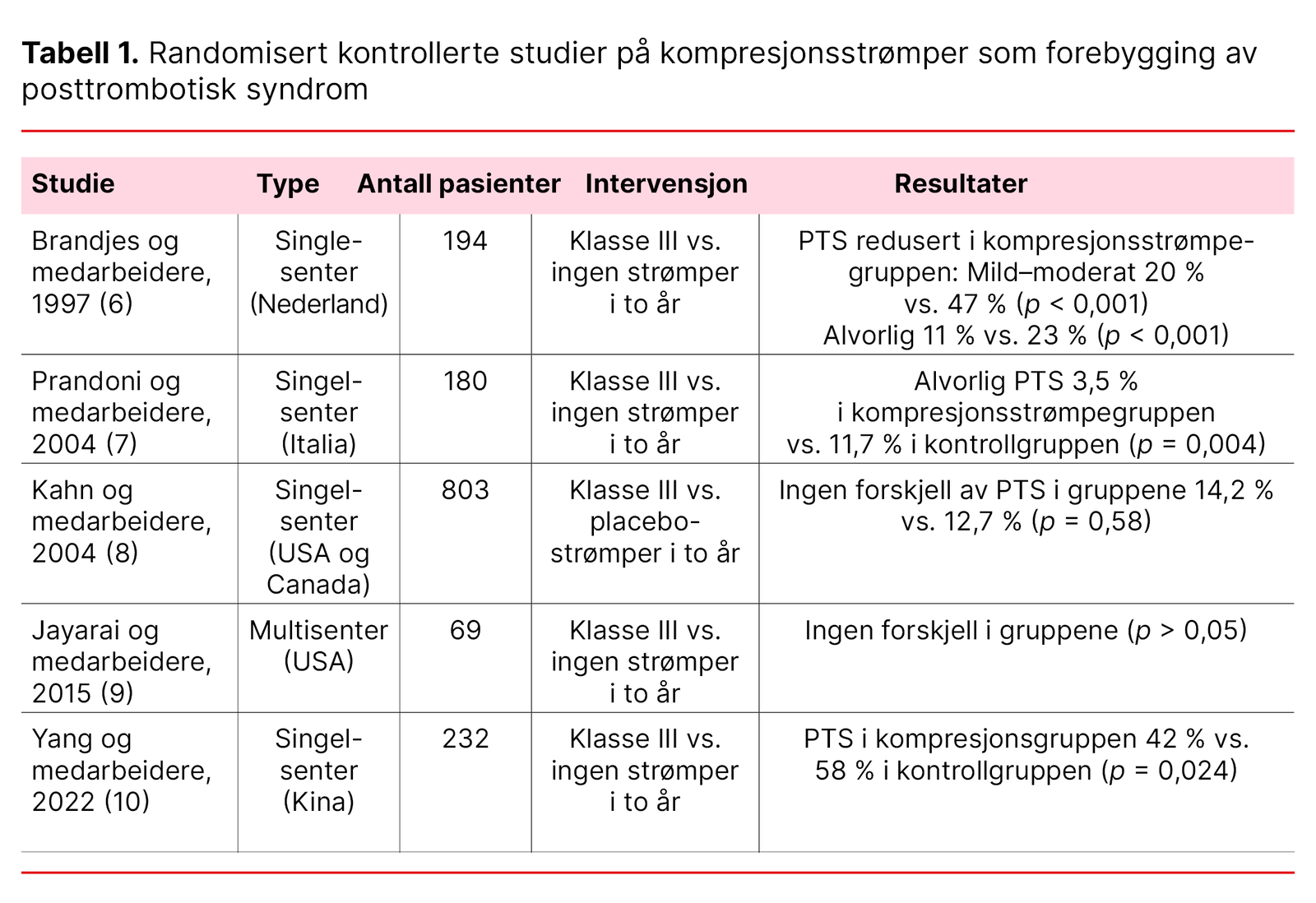 Den nyeste studien var en singelsenterstudie med 232 pasienter som ble randomisert til å bruke kompresjonsstrømper i klasse III eller ingen strømper i to år. Her fant forskerne en PTS-forekomst på 42 prosent i kompresjonsgruppen, sammenliknet med 58 prosent i kontrollgruppen (p = 0,024) (10).