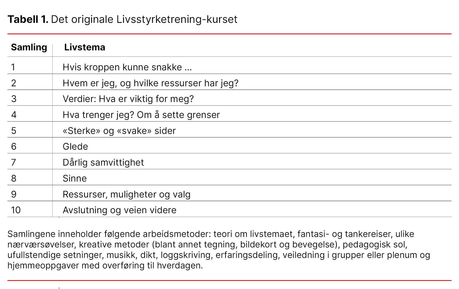 Med utgangspunkt i det originale Livsstyrketrening-kurset (se tabell 1) utarbeidet vi et komprimert, digitalt og frivillig kurs, der vi tilpasset fire livstemaer til sykepleierstudenters situasjon (se tabell 2).