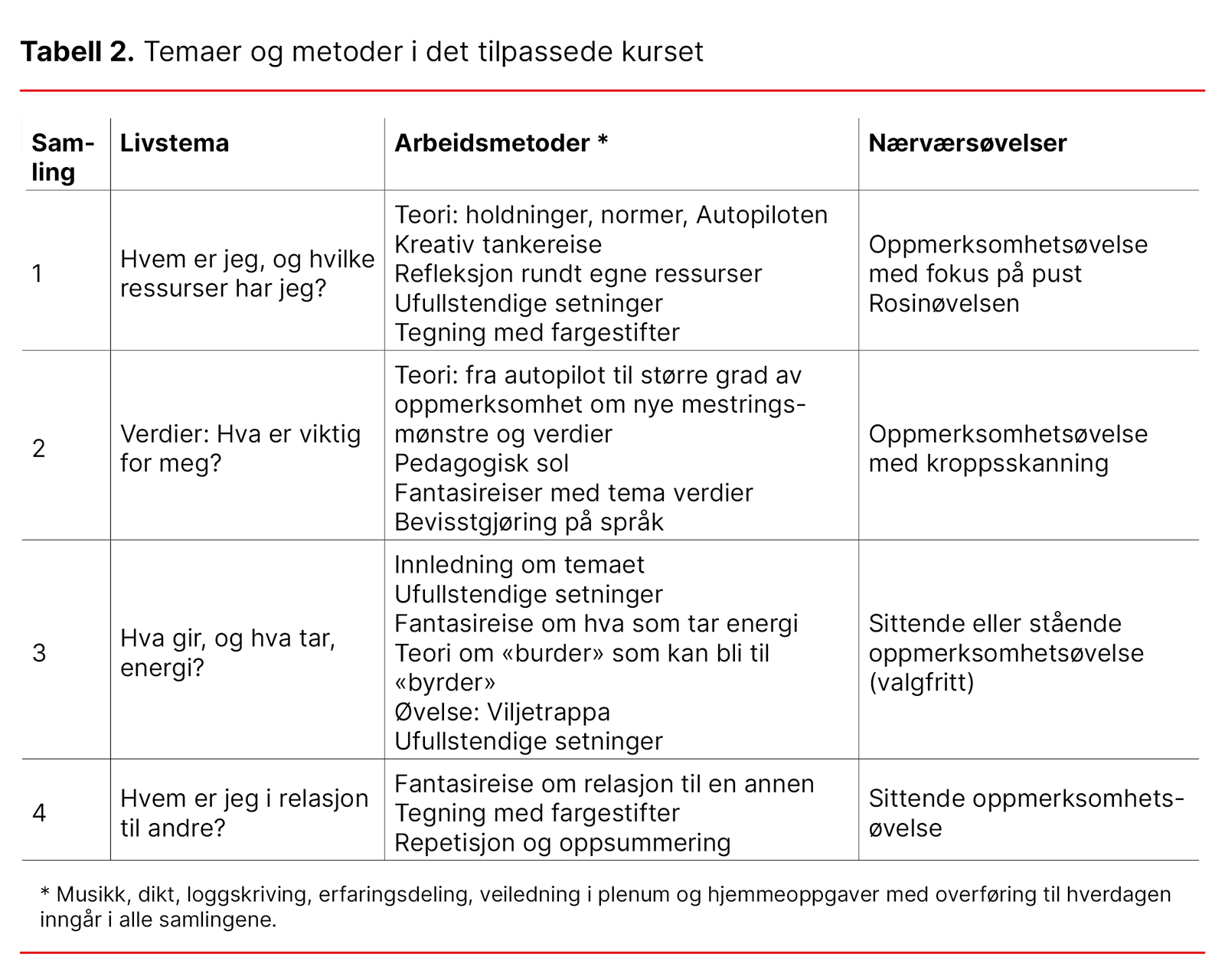 Sentralt i kurset er «livstemaer», oppmerksomt nærvær (mindfulness) og en forståelse av kroppen som en kilde til kunnskap (8). Bruk av kreative metoder legger til rette for oppdagelser og bevisste valg (9).