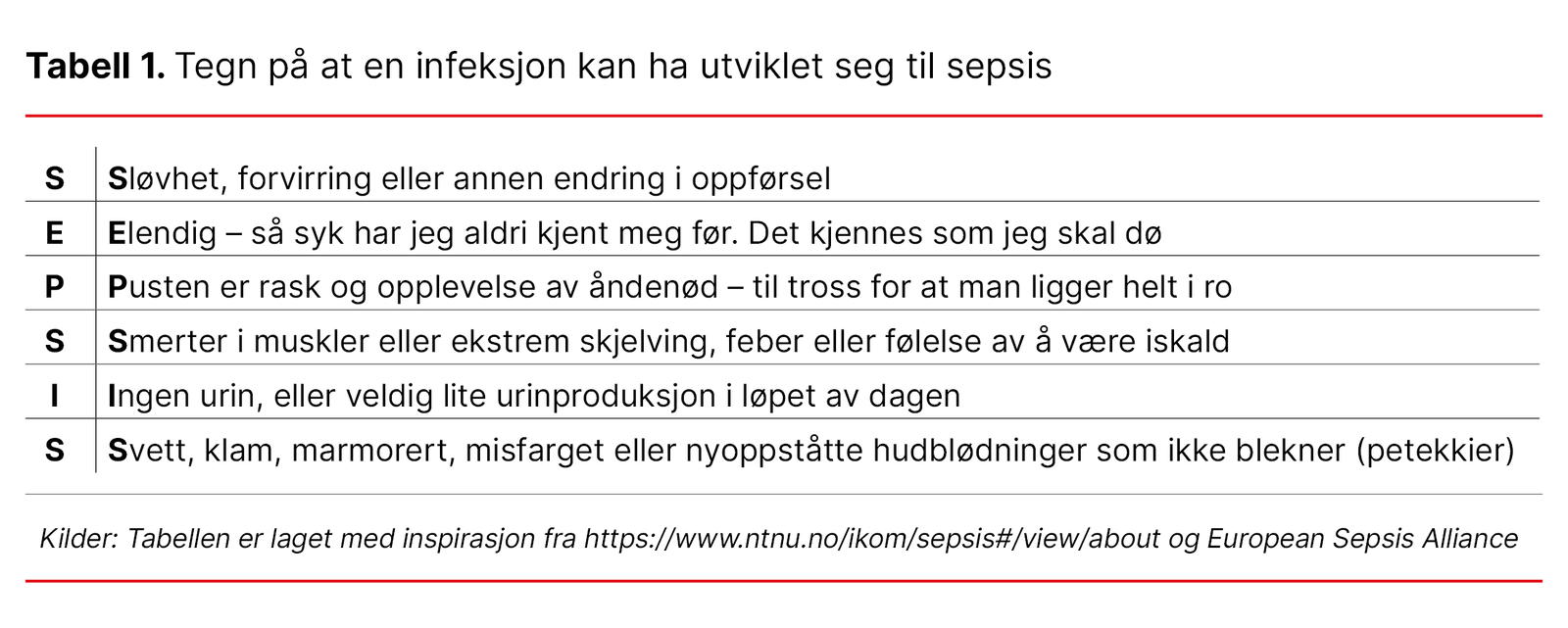 For pårørende og pasienter har sepsisforskere laget en enkel huskeregel for når man bør oppsøke lege umiddelbart for vurdering av mulig sepsis, altså ringe 113 (se tabell 1).