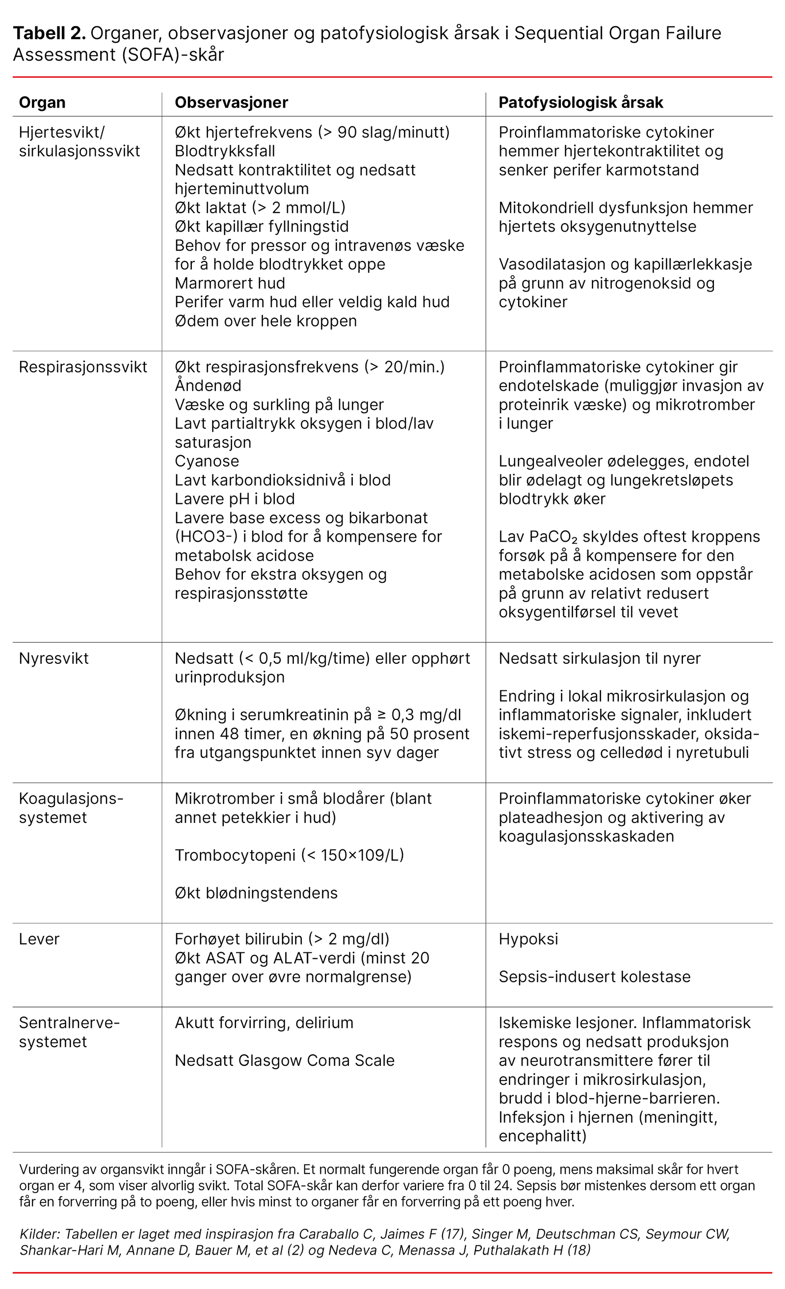 Tabell 2 viser en forenklet oversikt over hva som inngår i SOFA-skåren – hvilke observasjoner som gjøres, og hva som skjer i kroppen ved organsvikt forårsaket av sepsis. Oversikten er laget med inspirasjon fra Singer og medarbeidere, Nevada og medarbeidere og Carabello og Jaimes (2, 17, 18).