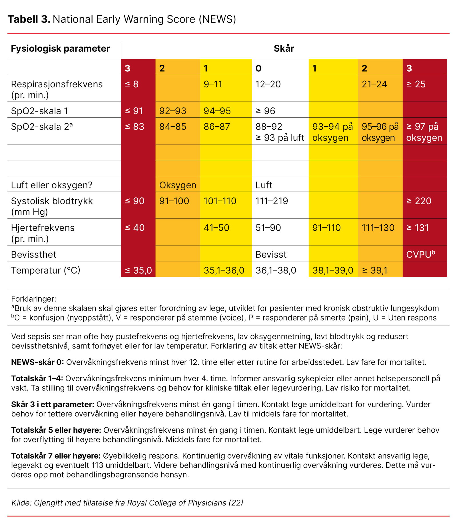 En samlet NEWS-skår på fem viser moderat risiko for alvorlig sykdom og skal føre til at lege tilkalles. Dersom ett enkelt parameter gir rød respons (3 poeng) hos en pasient med infeksjon, skal dette utløse sepsisalarm (8).