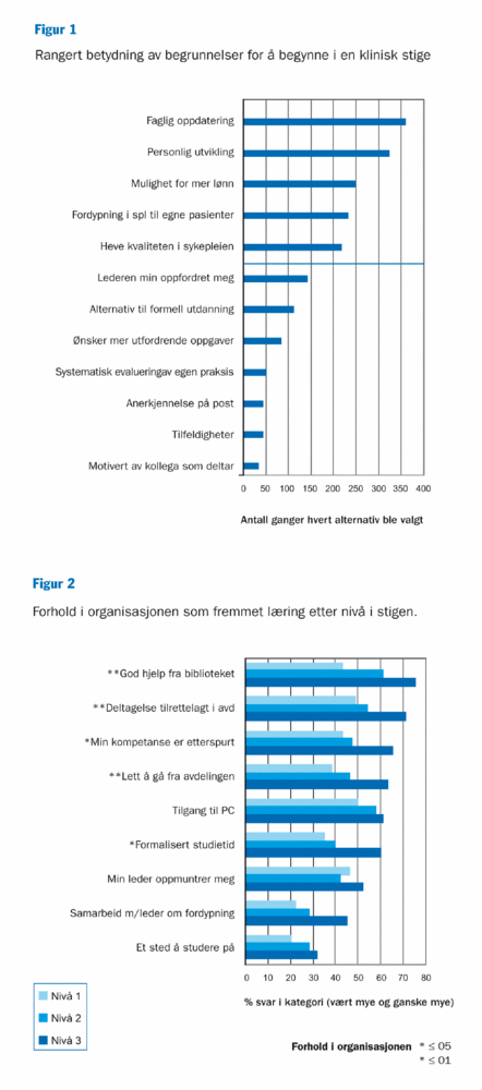 Sykepleiernes hovedbegrunnelser for å delta i kliniske stiger var knyttet til et ønske om personlig utvikling og til muligheten av å skaffe seg ferdigheter og kunnskaper som gjorde dem i stand til å gi bedre sykepleie til sine pasienter og generelt øke kvaliteten i omsorgen. Dette er typiske indre motivasjonsfaktorer som er viktig i utdanning av voksne og i et livslangt læringsperspektiv (10,21). Selv om ønske om høyere lønn ble rangert som tredje viktigste begrunnelse ble andre ytre motivasjonsfaktorer ganske lavt rangert. Høye skårer på ønske om å bedre sykepleiekvaliteten og å utvikle sykepleien til egen pasientgruppe viser at enkeltsykepleiere og helseinstitusjoner enten har sammenfallende interesser eller behov for læring på arbeidsplassen (3,4,22).