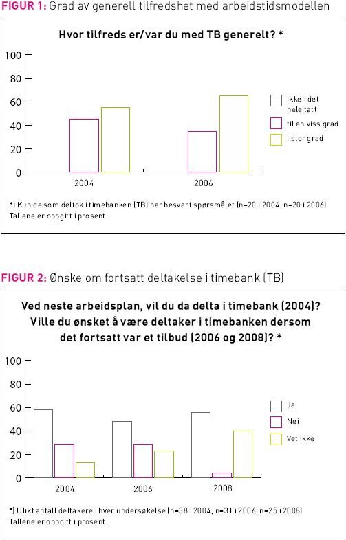Henholdsvis 58, 48 og 56 prosent av respondentene valgte å benytte seg av TB. Undersøkelsene som ble gjennomført i tidsrommet 2004-2008 viste at samtlige respondenter, enten i stor grad eller til en viss grad, var tilfredse med tilbudet (Figur 1). I 2004 svarte 90 prosent (n=18) av de som deltok i TB bekreftende på at fordeling av tildelte timebankvakter mellom ukedager og helger var tilfredsstillende. Like mange var i stor eller til en viss grad tilfreds med vektingen av timene. I 2006 bekreftet alle TB-deltakerne (n=20) at de til en viss eller i stor grad var tilfreds med timebanken. I januar 2008 ble det gjennomført en forenklet spørreundersøkelse på bakgrunn av ønske fra personalgruppen. Av de 35 som besvarte undersøkelsen ønsket 14 deltakere fortsatt å ha mulighet til å delta i TB (Figur 2).