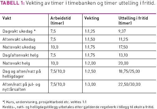 Haukeland Universitetssykehus har 8500 ansatte, disponerer 1100 senger og har et nedslagsfelt som lokalsykehus på over 300 000 innbyggere og som regionsykehus på 950 000 innbyggere. Sykehuset har en medisinsk intensiv- og overvåkingsavdeling (MIO) og en kirurgisk intensiv, samt en nyfødtintensiv og en brannskadeavdeling med landsfunksjon. MIO behandler årlig cirka 1500 pasienter. 35 prosent av disse er intensivpasienter, mange med behov for langvarig respiratorbehandling. MIO er som andre intensivavdelinger en enhet med store og uforutsigbare aktivitetsvariasjoner. Avdelingen har langt på vei klart å bemanne opp mot de krav til faglig standard som er en forutsetning for forsvarlig drift, men har likevel ikke en arbeidsplan og en grunnbemanning som tilfredsstiller vaktbehovet eller nasjonale bemanningsnormer ved en intensivavdeling (4,8). For å imøtekomme denne problemstillingen fikk personalet ved MIO i 2003 tilbud om frivillig deltakelse i en arbeidsplan med timebank (TB). TB belønner arbeidsfleksibilitet med økt lønn og fritid. Hensikten med å iverksette TB på MIO var å redusere bruk av merarbeid og ekstravakter, få et verktøy til å møte plutselige aktivitetsendringer og sikre trygghet og stabilitet for personalet. I foreliggende studie evalueres ikke alle aspekter med TB. Vi har valgt å ha et særlig fokus på å vurdere grad av tilfredshet med å delta i TB, mestring av uforutsigbar arbeidstid, opplevelse av trygghet og stabilitet på vaktene samt endring av stillingsprosent. Det finnes ulike varianter av TB. Noen ivaretar hovedsakelig arbeidsgivers interesser, andre er kombinasjonsmodeller som gir fordeler både for arbeidstaker og arbeidsgiver. Norsk Sykepleierforbund (NSF) har i 2007 utarbeidet en egen definisjon av TB: «Hensikten med TB er at arbeidstaker i en periode skal kunne arbeide flere timer enn oppsatt i turnus, for å kunne avspasere på et senere tidspunkt » (9). Denne er ikke sammenlignbar med TB-modellen på MIO. I september 2003 fikk personalet ved MIO anledning til å delta i TB etter en modifisert KUPAmodell (2), tilpasset våre forhold. Hundre prosent av arbeidstiden ble innledningsvis satt opp i arbeidsplanen. Deretter ble 25 prosent trukket ut igjen - hovedsakelig dagvakter på ukedagene - og satt inn på TB-kontoen. TB er dermed en «arbeidsbank» der du jobber inn timer du har i underskudd, og tar ut i fritid timer du har i overskudd. Det som var spesielt med TB ved MIO var at her fikk du «renter» på timene som ble satt inn i banken. Jo mer ubekvemme vakter du jobbet inn, jo høyere rente fikk du på investeringen. Rentene ble tatt ut i fritid (Tabell 1). Personalets fleksibilitet ble belønnet med en lønnsøkning på kr. 1000 per måned og en gjennomsnittlig reduksjon av årlig arbeidstid på 10 prosent. Avtalen den enkelte inngikk om arbeid i TB var frivillig. Det samme var hvilke vakter en valgte å jobbe inn. Så langt det var mulig, ble vaktene varslet 14 dager før. Ved stor aktivitet, sykdomsforfall eller behov for økt realkompetanse kunne vaktene varsles så sent som samme dag eller dagen før, og dekkes inn av dem som hadde mulighet til å komme på kort varsel. Avtalen kunne gjensidig sies opp med en måneds varsel. I løpet av de tre årene vi hadde timebank, valgte til sammen 35 sykepleiere å delta i TB.