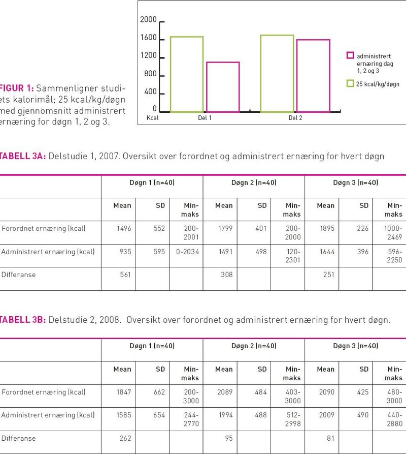 Innledningsvis stilles forskningsspørsmålet om det er en forskjell mellom forordnet og administrert mengde ernæring hos intensivpasientene. De to kartleggingene har vist signifikante forskjeller. Andre studier omtaler det som akseptabelt om administrert ernæring blir lik 90 prosent eller mer av forordnet ernæring (18;29). Omregnet i prosent ble det i våre kartlegginger administrert 78 prosent av forordnet ernæring i del 1 og tilsvarende 93 prosent i del 2. Altså en klar forbedring i del 2 som et resultat av fornyet fokus på temaet ernæring til intensivpasientene blant personalet i forbindelse med fremlegg av resultatene fra delstudie 1. Vi vil imidlertid fortsette å arbeide for å nå vårt mål med 100 prosent dekking av forordnet kaloribehov. Forordningen av ernæring bør gjenspeile pasientens reelle døgnbehov, slik at enhver differanse fra målet ansees som ikke optimalt. Ved analyse av differansen mellom gjennomsnittlig forordnet og administrert ernæring for hvert enkelt døgn ser vi en positiv trend. Forskjellen mellom forordnet og administrert ernæring reduseres gradvis fra døgn en til døgn tre. Pasienten stabiliseres ofte og vi som personalet får mer oversikt over pasientens behov dagene etter innleggelse. Det er derfor en naturlig konsekvens at ernæringstilførselen optimaliseres underveis. Videre ser vi at det i del 1 ble kun 70 prosent av studiets kalorimål på 25 kcal/kg/døgn administrert, mens i del 2 fikk pasientene hele 94 prosent sammenlignet med studiets kalorimål. Resultatet er vi tilfredse med. Utviklingen mellom studien i 2002, delstudie 1 og 2 kan forklares ved at personalet gradvis oppnådde mer faktakunnskaper og interesse for ernæring. Ernæringsprotokollen ble fulgt både ved forordninger og i forbindelse med opptrapping av hastighet samt behandling av ventrikkelaspirat. Intensivpasientene i del 2 fikk i stor grad dekket sitt individuelle behov for ernæring de tre første døgn etter innleggelse i intensivavdeling. Vi mener også at avdelingens rutinemessige regulering av pasientens blodsukker som ble innført mellom delstudie 1 og 2 har bidratt til en jevn og riktig fordeling av ernæringstilførselen gjennom døgnet, noe som også kan ha ført til en reduksjon av differansen mellom forordnet- og administrert mengde ernæring. Pasientgruppene i delstudie 1 og 2 var forskjellige med tanke på diagnose. Det var kun nevrokirurgiske pasienter i delstudie 1, mens det i delstudie 2 var en blandet diagnosegruppe. Dette kan ha påvirket resultatene. Vi mener likevel at siden personalgruppene var identiske, og det var ernæringspraksis vi hadde som mål å studere, så har diagnoseforskjellen mindre betydning. Dataene fra 2002 og 2008 viser at nevrokirurgiske pasienter ikke skilte seg fra de andre pasientene med tanke på forordning og tilførsel av ernæring. Mellom delstudie 1 og 2 utviklet det seg en rutine med å forordne individuelle kaloribehov og derav mer gjennomført dokumentasjon av pasientens vekt. På denne måten ble det satt tydeligere mål for ernæringsstøtten til intensivpasienten. Til tross for en klar forbedring av beregning av kaloribehov fra 0 prosent opptil 88 prosent har vi fortsatt et forbedringspotensial der målet er en tydelig forordning av kalorier, samt en bevisst fordeling av både karbohydrater, fett og proteiner.