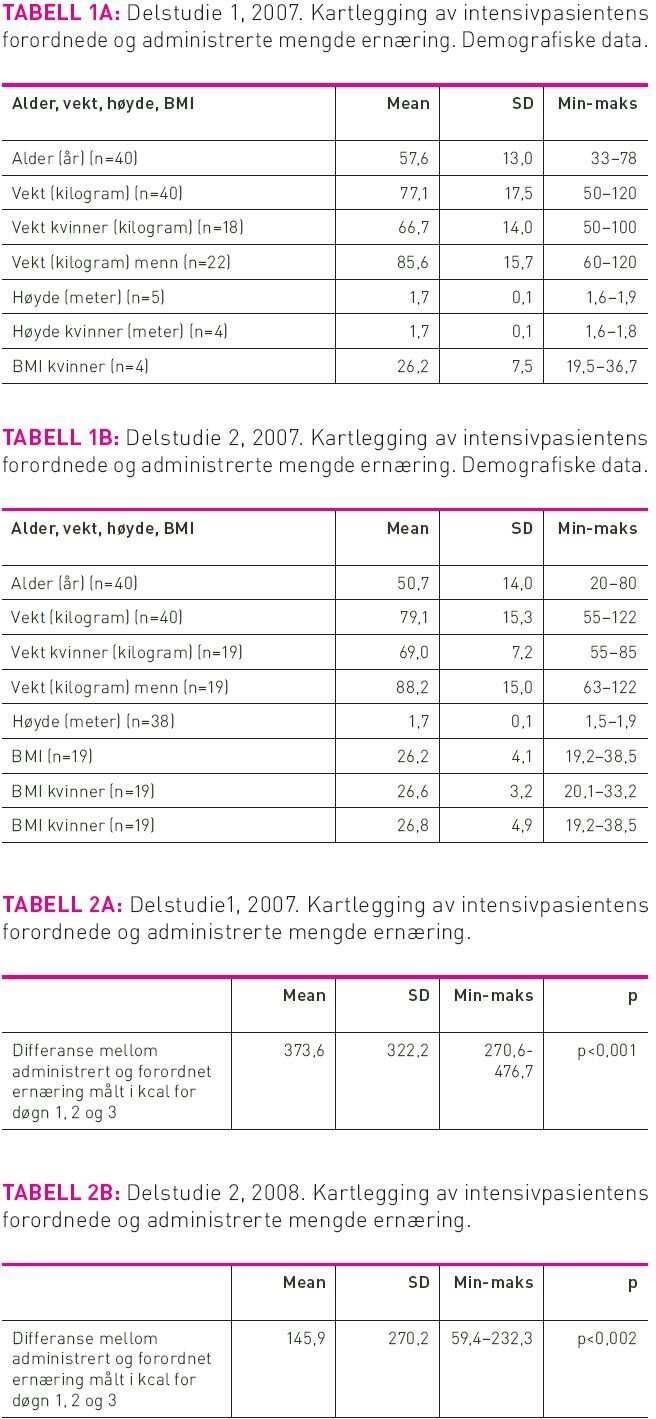 Det finnes mange holdepunkter for at etablert ernæring for intensivpasienten er positivt, og at feilernæring og underernæring i forbindelse med akutt, kritisk sykdom er ugunstig (1-3). Tidlig ernæringsstøtte til intensivpasienten kan bidra til lavere infeksjonsrisiko, redusert liggetid på respirator og redusert antall liggedøgn på sykehus totalt (4-6). Intensivpasienten får i varierende grad dekket sitt ernæringsbehov (7-9). Årsaker kan være sen oppstart av ernæringstilførsel, forordning av ernæringsmengde som ikke står i forhold til pasientens individuelle behov, og /eller patofysiologiske- og praktiske problemer med å tilføre pasienten forordnet mengde ernæring (10-12). Forskning viser at det å ha etablerte ernæringsprotokoller og/eller ernæringsteam kan gi positive effekter i forhold til ernæring av intensivpasientene (3;8;13;14). I 2002 innførte Generell Intensiv på Rikshospitalet en ernæringsalgoritme som medførte at pasientene startet tidligere med ernæring, og fikk forordnet og administrert mer ernæring sammenlignet med tidligere praksis (3). Forskjellen mellom forordnet- og administrert mengde ernæring var imidlertid signifikant, - bare 84, 2 prosent av den forordnede mengde ernæring ble tilført pasienten. I 2007 ble det gjennomført en retrospektiv oppfølgingsstudie (del 1 av 2) som viste ytterligere forbedring i ernæringstilførsel til pasientene, men at det fortsatt ble administrert signifikant mindre ernæring (kalorier) enn det som ble forordnet, og at forordningene var for lave sammenlignet med det litteraturen anbefaler for intensivpasienter. Ut ifra data fra studiene i 2002 og 2007 kom pasientens vekt og individuelle behov opp som viktige variabler å fokusere på. Som en ny oppfølgingsstudie (del 2 av 2) til innføring av ernæringsalgoritmen, ble det i 2008 gjennomført en prospektiv kartleggingsstudie ved samme avdelingsenhet. Hensikten var å se i hvilken grad intensivsykepleiere nådde målet om tilfredsstillende ernæringstilførsel til den kritisk syke pasient etter at enkelte rammebetingelser var etablert de siste årene. Intensivsykepleierne har ett til to års videreutdanning i intensivsykepleie og som oftest ansvaret for kun en pasient per vakt, mulighet til å følge pasienten gjennom intensivoppholdet og dermed tilstrekkelig tid og kunnskaper til å prioritere ernæring. Generell Intensiv har en ernæringsprotokoll som er rutinemessig godt innarbeidet, og som gir føringer for tidspunkt for oppstart og praktisk gjennomføring av ernæringen. Forskningsspørsmålene i oppfølgingsstudie del 2 er som følger: 1. Er det forskjell mellom forordnet- og administrert mengde ernæring (kalorier) hos intensivpasientene? 2. I hvilken grad får intensivpasienten dekket sitt individuelle behov for ernæring (kalorier) de tre første døgn etter innleggelse i intensivavdeling?