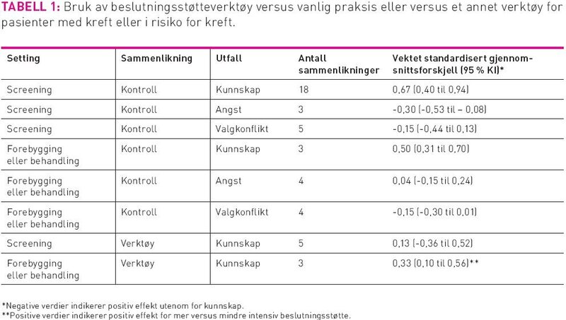 En metaanalyse viste at beslutningsstøtte bedret pasientenes kunnskap mer enn vanlig praksis i alle settinger. Det var ikke forskjell mellom gruppene når det gjaldt valgkonflikter (tabell). En metaanalyse viste at mer versus mindre intensiv beslutningsstøtte økte kunnskapen i forebyggingsog behandlingssettinger, men ikke for screening (tabell). Gruppene var ikke forskjellige når det gjaldt valgkonflikter (vektet gjennomsnittsforskjell - 0,07, 95 prosent konfidensintervall - 0,22 til 0,09). Det var ingen forskjell mellom ulike beslutningsverktøy når det gjaldt angst.