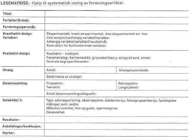Hvis man ikke er vant med å lese forskningsartikler kan det i starten være en utfordring å finne mening i stoffet. En litteraturmatrise kan fungere som hjelp til å finne de sentrale elementene i artikkelen. Forskningsartikkelen er en egen sjanger. De fleste er bygget opp rund IMRAD-strukturen (Introduction, Methods, Results and Discussion). I tillegg til det substansielle innholdet i artiklene, inneholder de metodebegreper. For å forstå disse begrepene kreves kunnskap om forskningsmetoder. Forskningsdesignet og metodene danner forutsetninger for hvilken type kunnskap studien utvikler. For at man skal være kvalifisert kritisk til resultatene og konklusjonene som presenteres, kreves dybdekunnskap om metode. Hensikten med lesehjelpen er å peke på noen av de mest sentrale metodebegrepene. Etter hvert som man noterer seg disse, kan man gå til faglitteraturen å finne mer ut av hva de betyr. Etter hvert utvikles forståelse og ferdigheter slik at man lettere kan finne styrker og svakheter ved studien artikkelen omhandler.