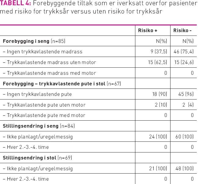 Hovedresultat: TS-prevalensen var 17,6 prosent inkludert grad 1 og 7,1 prosent inkludert kun grad 2-4. Den hyppigste lokalisasjon var hæler, dernest korsbenet. Av pasientene med behov for forebygging (dvs. BS<17 eller hadde TS) manglet 37,5 prosent trykkavlastende madrass i seng, 90 prosent var uten trykkavlastning i stol og ingen hadde planlagt stillingsendring i seng eller stol.