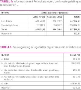 Det var 30 avdelinger (3 prosent) som oppga at de ikke brukte Felleskatalogen. Av de avdelingene som brukte Felleskatalogen var det 971 som brukte den trykte utgaven (94 prosent) mens tre avdelinger brukte PDA eller CD og 31 avdelinger brukte internettversjonen av Felleskatalogen. To avdelinger svarte ikke på dette spørsmålet. Av de 1005 avdelingene som oppga at de brukte Felleskatalogen anga 40,7 prosent at det var lett å finne og lett å forstå informasjon om knusing og deling av medikamenter i Felleskatalogen. Resten opplevde problem på et av disse to områdene (tabell 4). Det var 363 avdelinger (35,0 prosent) som oppgav at de ikke brukte pakningsvedlegget. Av de som brukte pakningsvedlegget var det langt de fleste som brukte vedlegget som lå i medisinesken (574; 55,4 prosent) mens 53 avdelinger (5,0 prosent) brukte internettutgaven. Av de 626 avdelingene som brukte pakningsvedlegget, var det 307 (59,1 prosent) som oppga at informasjonen i pakningsvedlegget om knusing/deling av medisiner var lett å finne og lett å forstå. Resten mente at informasjonen var lett å finne, men kunne være uklar (122; 19,5 prosent), vanskelig å finne, men lett å forstå (54, 8,6 prosent) eller både vanskelig å finne og kunne være uklar (56; 8,9 prosent). Tjuefire av avdelingene (3,8 prosent) oppga at de brukte pakningsvedlegget til informasjon om knusing/deling av medisiner og svarte ikke på dette spørsmålet.