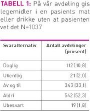 Nesten halvparten av avdelingene oppgav at de ga medisin knust i pasientenes mat eller drikke uten at pasientene visste det, i hvert fall av og til (tabell 1). Det var signifikant flere somatiske/ andre avdelinger som svarte at de aldri ga medisin uten at pasientene visste det, enn skjermede enheter (57,2 prosent vs 40,4 prosent; chi-kvadrat test p