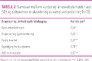 Alle deltakere var «fornøyde» med kurset totalt sett. Det vil si at ingen rangerte kurset som dårligere enn 6 på en skala fra 1–10 (median=8), hvorav fire deltakere rangerte det som svært bra (=10). Boksplottet (figur 2) viser hvordan deltakerne vurderte ulike spørsmål knyttet til gjennomføringen av SØK (median og interkvartiler). Boksen representerer 50 prosent av verdiene, mens de horisontale linjene utenfor angir maksimum og minimum verdier. Markert linje i boksen representerer median. Tabell 2 viser hvilke spørsmål som korrelerte med deltakernes totalvurdering av kurset.