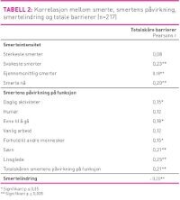 Omkring 41 prosent hadde metastatisk kreftsykdom og omtrent 36 prosent var i et palliativt behandlingsopplegg. Pasientenes smertekarakteristika er vist i tabell 1. Pasientene hadde en gjennomsnittskåre på 4,5 (SD 2,1) på «gjennomsnittlig» smerte. Når man så på hvordan smertene påvirket pasientens funksjon, varierte skåren fra 3,5 (SD 2,9) (forhold til andre mennesker) til 5,1 (SD 3,1) (vanlig arbeid). Tabell 2 viser hvordan totalskåren av barrierer korrelerer med smerteintensitet og smertens påvirkning på funksjon og smertelindring. De aller fleste variablene korrelerte med total barrierescore, men korrelasjonene var lave. Den høyeste korrelasjonen var mellom total barrierescore og livsglede (r =0,25), og søvn (r =0,21). Det vil si at de som har høyere barriereskår også opplever at smertene i større grad påvirker livsglede og søvn. Totalskåren for barrierer var 2,20 (SD 0,8). Om pasientene hadde metastaser eller ikke eller om de var i et palliativt eller kurativt behandlingsløp, så påvirket ikke det den totale barriereskåren (data ikke vist). I tabell 3 er de ulike utsagnene på barriereskjemaet vist sammen med hvor stor prosentvis andel av pasientene som har uttrykt relativt stor enighet (> 4) når 5 er «fullstendig enig». Spørsmålene som reflekterte de høyeste barrierene for smertebehandling var spørsmål om avhengighet, toleranse, det å monitorere symptomer i forhold til egen helsetilstand og nye smerter og redsel for enkelte bivirkninger. Flest pasienter mente at døsighet var den bivirkningen som var vanskeligst å håndtere. Færrest pasienter var enig i at medisiner ikke kan lindre kreftsmerter og at smertestillende fører til at du gjør eller sier pinlige ting. Det var også mindre prosentvis enighet om at kommunikasjon om smerter til andre eller å fortelle legen om smerte kan ha uheldige konsekvenser. Mindre enn 20 prosent av pasientene var enige i at bivirkninger som kvalme og forstoppelse er vanskelige å håndtere.