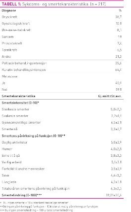 Pasientene som er inkludert i studien var polikliniske kreftpasienter over 18 år som hadde smerter eller brukte smertestillende medisiner og som kunne forstå, skrive og snakke norsk. Rekrutteringen ble gjennomført på en slik måte at muligheten for skjevhet i utvelgelsen ble redusert. Innhenting av data ble gjennomført like mange dager og på de samme dagene på alle poliklinikkene. Alle pasientene som kom til en poliklinikk i de utvalgte periodene fikk skriftlig informasjon om studien fra helsepersonell som satt i ekspedisjonen. Som en del av informasjonsskrivet ble pasientene screenet for om de hadde smerter eller brukte smertestillende medisiner. De pasientene som oppfylte inklusjonskriteriene ble forespurt om å delta i studien. De som ønsket å delta undertegnet et informert samtykke. De fikk også med seg et spørreskjema hjem som de senere returnerte i en frankert svarkonvolutt. Enkelte besvarte skjemaet på poliklinikken. En purring på manglende svar ble gjennomført over telefon etter tre uker. I hele datainnsamlingsperioden var det 4404 pasienter på poliklinikken og av disse ble 1790 screenet for inkludering, og 1549 responderte på screeningen. Av disse hadde 332 pasienter smerter eller brukte smertestillende medisiner og 270 sa ja til å delta. Det var 53 pasienter som allikevel ikke sendte inn spørreskjema, slik at det var 217 pasienter med i studien. Dette utgjør 65 prosent av alle pasientene som hadde smerter. Av pasientene som besvarte spørreskjemaet hadde 53 prosent av pasienten kun kreftrelaterte smerter, 22 prosent hadde både kreftrelaterte smerter og smerter av annen årsak og 25 prosent hadde smerter av annen årsak enn kreft eller behandling av kreftsykdommen (6). Alle pasientene leverte skriftlig informert samtykke og studien er godkjent av Regional etisk komité, Datatilsynet og Protokollutvalget ved Oslo universitetssykehus, Radiumhospitalet.