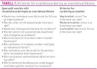 Kvalitetsvurderingen av oversiktsartiklene er basert på Kunnskapssenterets kriterier for vurdering av systematiske oversikter (tabell 1) (7). Vurderingen av artiklene ble gjort ved hjelp av kategoriene: Møtt, uklar/delvis møtt og ikke møtt (5). Vurderingen av det vitenskapelige grunnlaget for hver av faktorene som bidro til demensvennlige fysiske omgivelser, ble gjort på bakgrunn av Jamtvedt og medarbeideres (5) kriterier (se tabell 2). Kriteriene baseres både på kvalitetsvurdering av oversiktsartiklene og av primærstudiene. Oversiktsartiklene med høy kvalitet inneholder vurderinger av primærstudiene som er inkludert i oversiktsartiklene. Utvelgelsen og kvalitetsvurderingen av artiklene er gjort av førsteforfatter i nært samarbeid med andreforfatter.