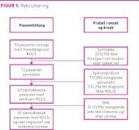 I løpet av studieåret ble 93 pasienter innlagt med hoveddiagnose KOLS-forverring, mens 50 er inkludert. Figur 1 «Rekruttering» viser årsak til frafall. Pasientene ga skriftlig informert samtykke, og kunne trekke seg fra studien når de ønsket. Mange pasienter innlegges flere ganger per år, og de ble invitert til å delta ved hver innleggelse. Det ble totalt registrert 132 opphold dette året. Vi valgte ut ett opphold for hver pasient der det var registrert vekt ved innkomst og utreise. Pasienter som ikke fikk verifisert diagnosen KOLS ved spirometri, ikke kunne samarbeide og som hadde malign konkurrerende sykdom ble ekskludert. Studieutvalget ble naturlig delt i to grupper; atten pasienter (36 prosent) hadde medisinske kriterier som utløste oppstart NIVbehandling (NIV-gruppen), resten utgjør Gruppe 2.