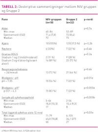 I studieutvalget (n=50) var det 28 (56 prosent) menn og 22 (44 prosent) kvinner. Gjennomsnittsalder var 73 år, spredningen 53–89 år. Hovedvekten (78 prosent) hadde avansert grad av KOLS. Tretten (26 prosent) var røykere, bare to hadde aldri røykt (se tabell 2). Tabell 2 viser statistiske forskjeller på variablene blodgass, hvor NIV-gruppen har høyere nivå av CO² og lavere nivå av pH i blodet. NIV-gruppen har også lengre liggetid både per sykehusopphold og per år.