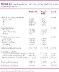 Alle analyser er utført med statistikkprogrammet SPSS 15.0. Valg av analyser er gjort sammen med statistiker. Utvalgets karakteristika ble summert med deskriptiv statistikk. Sammenligninger mellom NIV-gruppen og Gruppe 2 ble gjort med Kjikvadrattest og Mann-Whitney. Begge er velegnet til å finne om variabler er uavhengige eller like på tvers av grupper (28). Kjikvadrattest er egnet for kategoriske variabler, mens Mann-Whitney også er egnet for intervallvariabler. Kjikvadrattest er ikke velegnet når antallet observasjoner i hver kategori blir for lav. Mann-Whitney kan rangere ulikheter i middelverdi og spredning når antallet observasjoner er få og normalitet i dataspredning ikke kan antas (28). Logistisk regresjon ble brukt for å se på enkelte variablers sammenheng (målt ved odd ratio) med lav KMI eller vektnedgang. Parvis t-test ble benyttet for å teste endring mellom innkomstvekt og utreisevekt. Parvis t-test ser på endringer i gjennomsnittsverdi og er egnet ved små utvalg (28). Signifikansnivået (p) ble satt til 0,05 på alle tester.