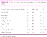 De fleste (72 prosent) spiste tre måltider hjemme, men mange hadde også fire måltider (26 prosent). Spredning i KMI ved innkomst var 12,5–44,8 mens KMI i gjennomsnitt var 24. 19 pasienter (38 prosent) var undervektig ved innkomst på sykehuset, og ni (18 prosent) var normalvektige, til sammen 28 (56 prosent) i ernæringsmessig risiko. Ernæringsmessig risiko ved innkomst var assosiert med KOLS grad 4 (p=0,03; OR=8,7; 95 prosent CI 1,3– 51). Røykernes gjennomsnittlige innkomstvekt var ti kilo lettere enn ikke-røykerne, men dette nådde ikke statistisk signifikans (p=0,1; t= – 1,6; 95 prosent CI – 24 – 2,3). Ernæringsstatus ved innkomst var statistisk lik for NIV-gruppen og gruppe 2 (se tabell 3). Totalt 28 pasienter (56 prosent) hadde vekttap under sykehusoppholdet. Den pasienten som gikk ned mest tapte 6,6 kg, mens største vektoppgang var 6,3 kg. NIVgruppen hadde større tendens til mer alvorlig vekttap (se tabell 3). Vekttap er mest alvorlig for de med undervekt og normalvekt (14), og tabell 4 viser detaljer for vekt og vektendringer for de ulike KMI-klassene. Den personen som gikk ned flest antall kilo under oppholdet var undervektig ved innkomst, og den undervektige gruppen hadde flest med vektnedgang (p=0,09). Logistisk regresjon ble brukt på variabler som kan tenkes å forklare alvorlig vekttap (se tabell 5). En odd ratio over 1 betyr økt sjanse for alvorlig vektnedgang (hver tidel øker sjansen 10 prosent). Hvert liggedøgn på sykehus øker dermed sjansen for alvorlig vekttap med 80 prosent (p=0,017). En odd ratio under 1 betyr redusert sjanse for vektnedgang (hver tidel minker sjansen 10 prosent). Hver dag utover tre dager med NIV-behandling minker sjansen for vekttap med 60 prosent. Alle som behandles med NIV tre dager eller mindre mister vekt. Ingen andre parameter har statistisk sammenheng med vektnedgang. Økt sannsynlighet for et langt sykehusopphold, definert som lengre enn 14 dager, er forbundet med lav innkomstvekt (p=0,019) og lav KMI (p=0,009) for pasienter i studieutvalget (n=50). NIV-behandling gir også langt sykehusopphold (p=0,003).