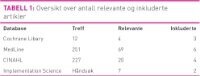 Titler og abstrakter ble lest av første og andre forfatter. Inklusjonskriteriene var at tittel eller abstrakt kunne knyttes til implementering av kunnskapsbasert praksis og undersøkelsen måtte være gjort i sykehus eller sammenlignbare helseinstitusjoner. Artiklene måtte være publisert etter 1995, og bare studier som var formidlet på engelsk eller på et skandinavisk språk ble inkludert. Vi søkte i første rekke etter oppsummert forskning i form av systematiske oversikter. Enkeltstudier som ikke var med i de inkluderte oversiktene, ble inkludert og ikke begrenset til design. Tabell 1 gir en oversikt over antall treff og inkluderte studier.