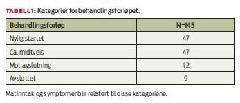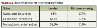 Helhetsbilde av de undersøkte pasientene viser at de som får strålebehandling har en noe bedre ernæringsstatus enn forventet. Matinntak den siste måneden var uendret for 64 prosent og mindre enn vanlig for 28 prosent av informantene. 6 prosent hadde økt matinntak. Ser man på matinntak i forhold til hvor pasientene var i behandlingsforløpet, lå svarprosenten gjennomgående høyest på uendret matinntak (tabell 2).