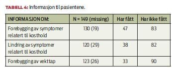 På spørsmål om hvem som ga dem informasjonen, oppga respondentene at det var sykepleier eller sykepleier og lege sammen. Derimot var ernæringsfysiologer meget lite representert. Kun to personer (n=93) oppga å ha fått informasjon av ernæringsfysiolog.