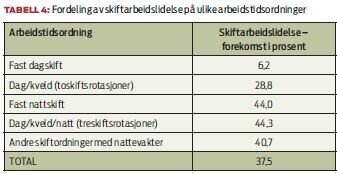 Søvn- og trøtthetsproblemer er svært vanlig blant skiftarbeidere. Vi undersøkte forekomsten av søvn- og søvnighetsproblemer knyttet til arbeidstidsordningen – "skiftarbeidslidelse" (se tabell 3). I alt 37,6 prosent av sykepleierne i vår studie hadde en skiftarbeidslidelse. Som vist i tabell 4, varierte forekomsten av disse jobbrelaterte søvn- og trøtthetsproblemene fra 6,2 prosent blant dagarbeidere til 44,3 prosent blant dem som jobbet treskiftsrotasjoner (dag/kveld/natt). Det å ha en arbeidstidsordning som inkluderer nattevakter, høy alder, høyt antall skift med mindre enn 11 timer fri mellom skiftene, høyt antall nattevakter de siste 12 månedene, søvnløshet (insomni), angst og det å ha lett for å bli trøtt, økte sjansen for skiftarbeidslidelse. Å være en fleksibel person i forhold til sovevaner, og å være kvinne var forbundet med en lavere risiko for skiftarbeidslidelse. Disse kjønnsforskjellene skilte seg fra tidligere forskningsfunn.