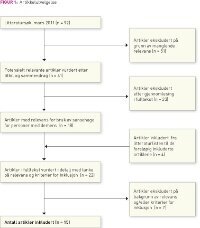 Nittito originale artikler ble gjennomgått ved hjelp av tittel og abstrakt. Femtien av disse ble ekskludert ettersom de enten ikke var forskningsartikler, ikke var rettet mot personer med demenslidelser eller benyttet bruk av sansehage, terapeutisk hagebruk eller «grønn miljøbehandling». Førtien artikler ble etter første gjennomgang vurdert som potensielt relevante og gjennomgått i fulltekst. Tjuetre av disse ble ekskludert fordi de ikke beskrev en relevant intervensjon, ikke var empiriske studier eller undersøkte personer med demens. Litteraturlistene i det foreløpige utvalget ble gjennomgått og fire potensielt relevante artikler innhentet. Etter en grundig gjennomlesning i fulltekst med tanke på endelig inkludering i lys av relevans og kriterier for inkludering, ble ytterligere sju artikler ekskludert. Totalt ble 15 artikler inkludert med tanke på relevans og kriterier for inklusjon. Figur 1 sammenfatter artikkelutvelgelsen.