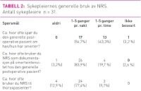 Smertedokumentering: 30 av 31 sykepleiere svarte at de spør den generelle postoperative pasienten om han har smerter og dokumenterer NRS minst en gang per vakt. 27 av 31 sykepleiere svarte at de også bruker NRS til thoraxpasienten (tabell 2).