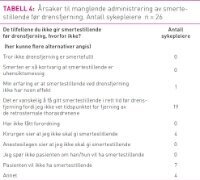 På spørsmålet om årsaker til manglende administrering av smertestillende før drensfjerning, svarte 19 av 26 sykepleiere at det er vanskelig å få gitt smertestillende i rett tid før drensfjerning fordi de ikke visste tidspunktet for drensfjerningen. På svaralternativet «annet», oppga tre av 26 sykepleiere respirasjonsdepresjon som årsak til manglende administrasjon av smertestillende og én sykepleier svarte at hun eller han alltid gir smertestillende (tabell 4).