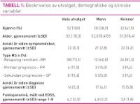 Utvalget besto av 52 personer hvorav 20 menn og 32 kvinner med gjennomsnittsalder 52,1 år (± 8,3). For utfyllende oversikt over demografiske og kliniske variabler, se tabell 1.