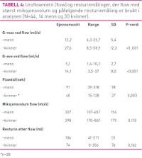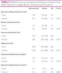 Sammenheng mellom symptomer og funn: Førtito personer hadde fylt ut miksjonslister i to døgn (tabell 3). Gjennomsnittlig minste enkeltvolum var mindre hos kvinner enn hos menn (henholdsvis 86 og 141 ml), ellers var det ingen kjønnsforskjeller. Funn i miksjonslister samsvarte med hva respondentene anga som symptomer på IPSS om pollakisuri (r=0,70, p