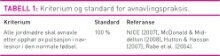 Vi satte også en standard for avnavlingspraksis. En standard blir sett på som det man skal nå for at kvaliteten oppfattes som akseptabel, og blir presentert i prosentsats. En standard beskriver det realistiske målet for praksis (7), og i dette prosjektet tok vi utgangspunkt i at kartleggingen av avnavlingstidspunkt omhandlet den normale fødsel og fødsel av friske barn. Kriteriet og standard for den jordmorfaglige audit er presentert i tabell 1.