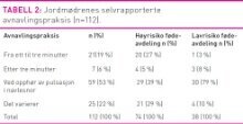 Omtrent halvparten av jordmødrene avnavlet ved opphør av pulsasjon, og i tråd med standard for god praksis (tabell 2). Ved høyrisikofødeavdeling svarte 39 prosent av jordmødrene at de avnavlet ved opphør av pulsasjon i navlesnor, mens denne andelen var 79 prosent ved lavrisiko fødeavdeling (tabell 2). Forskjellen var statistisk signifikant (p =