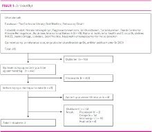 Litteratursøket og gjennomlesing av referanselister ga 612 treff. Bibliotekar samkjørte databasetreffene i Medline, Cinahl og Embase og fjernet 164 dubletter. Det var også to dubletter i Cochrane, totalt 166 dubletter. Av antall titler og sammendrag til gjennomlesing ble 446 og 403 vurdert som irrelevante. Totalt ble 43 artikler og retningslinjer lest i fulltekst. Av disse ble fem retningslinjer og en systematisk oversikt vurdert, 34 artikler ble ekskludert og vi endte opp med tre RCT-studier (21–23). Karakteristika og kvalitetsvurdering av de tre inkluderte enkeltstudiene er beskrevet i tabell 1 og 2. Resultatene fra litteratursøket er beskrevet i figur 1.