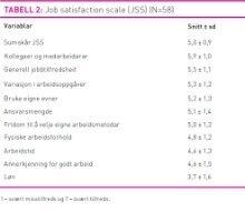 Cronbach’s a for JSS var 0,89. Samla JSS sumskår var 5,0 ± 0,9, og 10 personar (17,2 prosent) hadde ein sumskår = 4 poeng. Dei fleste variablane hadde litt skeiv positiv fordeling. Det var ingen betydeleg «tak»- eller «gulv»-effekt, noko som indikerer at få hadde skår i ytterkantane av skalaen. Sjukepleiarane var mest nøgd med sine kollegaer og minst nøgd med løn (Sjå tabell 2 og 3).