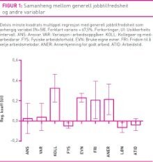 Korrelasjonsanalyse mellom variablane i JSS, viste at generell jobbtilfredsheit var sterkast korrelert med muligheit å få brukt sine evner og svakast korrelert med løn (tabell 3). Prinsipal komponent analyse viste ein einfaktorløysing som forklarte 51,8 prosent av variasjonen. Løn lada svakast på denne komponenten (0,61), mens muligheit å få brukt sine evner lada sterkast (0,86). To andre faktorar forklarte over 10 prosentar kvar, men var lite tolkbare. Multippel regresjon viste at kollegaer og medarbeidarar, muligheit for å få brukt eigne evner, velje eigne arbeidsmetodar og anerkjenning for godt arbeid predikerte generell jobbtilfredsheit (figur 1). Effekten av dei andre variablane var ikkje signifikante eller trivielle. Modellen forklarte 67, 5 prosent av variasjonen i generell jobbtilfredsheit. I forhold til forbetringspotensiale var, anerkjenning for godt arbeid, særleg viktig fordi skåren på denne variabelen var relativt låg og hadde god evne til å predikere generell jobbtilfredsheit (data ikkje vist). Alle skår på JSS var signifikant korrelert med kvalitet på sjukepleie, unnateke løn (tabell 4). I forhold til livstilfredsheit var alle skår på JSS signifikant korrelert med dette. (Sjå figur 1 og tabell 4.)
