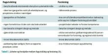 I dagligtalen er fagutvikling et «sekkebegrep» vi bruker om endringer som skjer i praksis og som er besluttet gjennomført. Begrepet brukes om forbedring av rutiner, prosedyrer, undervisningsopplegg, veiledning, ulike prosjekter, implementering av ny kunnskap, kvalitetsarbeid eller forskning. Ordet fagutvikling finnes ikke i ordlister og oppslagsverk (3) selv om det er mye brukt i hverdagsspråket for å beskrive en aktiv utviklingsprosess innen et fagområde. I mange sammenhenger er fagutvikling synonymt med kompetanseutvikling. Kompetanse omfatter de kunnskaper, ferdigheter, evner og holdninger som har betydning for å gjennomføre en definert oppgave på en tilfredsstillende måte (4). Et annet begrep som ofte brukes synonymt med fagutvikling er forskning. Begge begrepene er knyttet til kunnskapsutvikling, men fagutvikling handler om å omsette eksisterende kunnskap eller viten i praksis, mens forskning har som mål å utvikle ny kunnskap (5). I den kliniske hverdagen er det behov for både fagutvikling og forskning. Blant annet viser kunnskapsbasert praksis (7) hvordan man i den kliniske hverdagen kombinerer fagutvikling med forskning når man utarbeider behandlingsplaner.