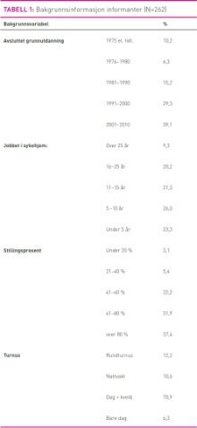 262 informanter deltok i undersøkelsen, det vil si en svarprosent på 67,1. Antall hjelpepleiere i undersøkelsen var lavt (3 prosent), og det var ingen forskjell mellom hjelpepleiere og sykepleiere i analysene. Alle informanter benevnes derfor sykepleiere heretter. Gjennomsnittlig størrelse på sykehjemmene var 30 senger. Omtrent 20 prosent jobbet på sykehjem med 20 eller færre sengeplasser, mens 13 prosent jobbet i sykehjem med mer enn 50 sengeplasser. Gjennomsnittlig avdelingsstørrelse var 18 senger (SD 8,5). Legedekning var gjennomsnittlig 3–4 timer per uke. Omtrent sju prosent av sykepleierne hadde videreutdanning i geriatri. Avsluttet grunnutdanning, antall år erfaring fra sykehjem, nåværende stillingsprosent og turnus i avdelingen er presentert i tabell 1.